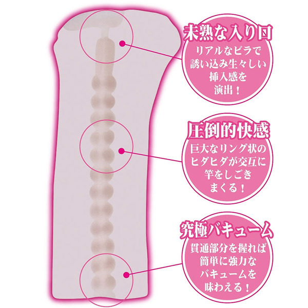 みおちゃんの優雅で無垢なボディをイメージした入り口はリアルなビラで生々しい挿入感を演出!その後、巨大なリング状のヒダヒダが交互に竿を刺激して最高の快楽へと導きます。