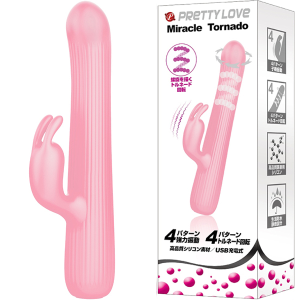 螺旋回転がGスポットを擦り上げるように刺激!更にウサギ型の子機が強力振動でクリをピンポイントで刺激します!●4パターンのトルネード回転●4パターンの子機振動●高品質シリコン素材●生活防水●静音設計●専用USB充電コード付属、充電時間:90分、連続稼働時間:50分