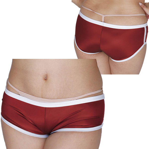 ホットパンツとブルマが合体したようなデザインが特徴的!やわらかな光沢感が美しい日本製の体操服コスプレ(エンジ)。
