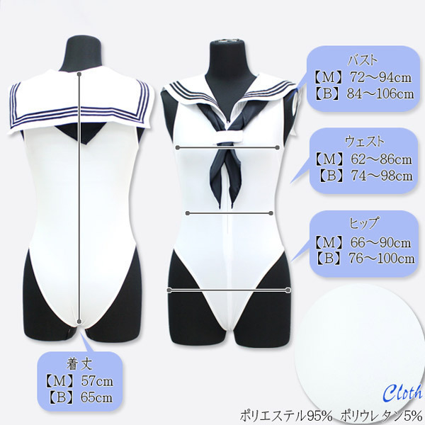 仕様:BIGサイズ:B84〜106cm・W74〜98cm・H76〜100cm 着丈65cm セット内容:レオタード(前ファスナー)、スカーフ(マジックテープ) 素材:ポリエステル95%、ポリウレタン5% セーラーノースリーブレオタード 色:白