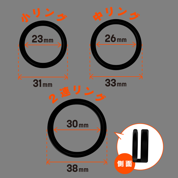内径23mmの小サイズ、26mmの中サイズ、30mmの2連リング、そして自分の身体に合わせてサイズ変更できる内径調整リングの4個付属。